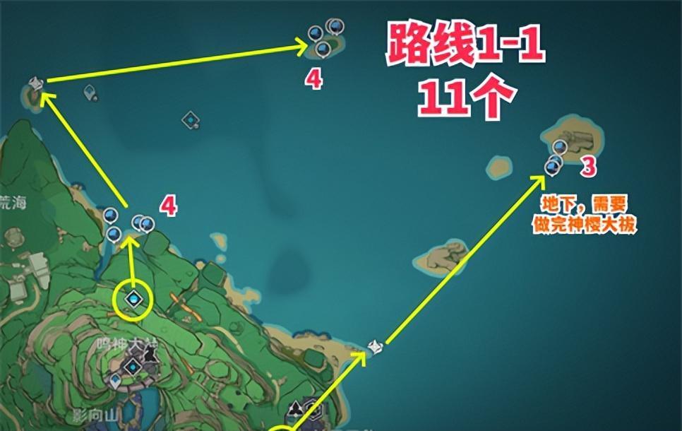 注意事项:路线1-1的几个海灵芝在地下,需要进行任务【神樱大祓】 ,拿到留念镜打开岛屿的屏障才能进去。