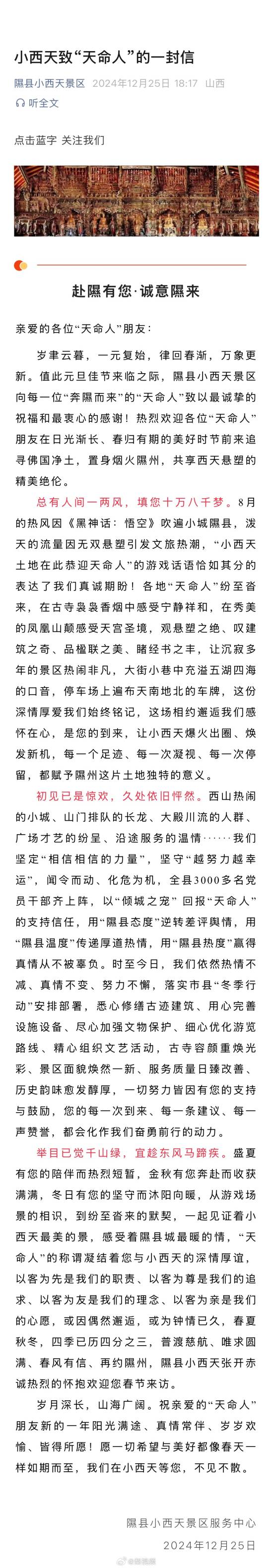 据梨视频消息,12月25日,“隰县小西天景区”公众号发布《小西天致“天命人”的一封信》,表达了对各地“天命人”的感谢: