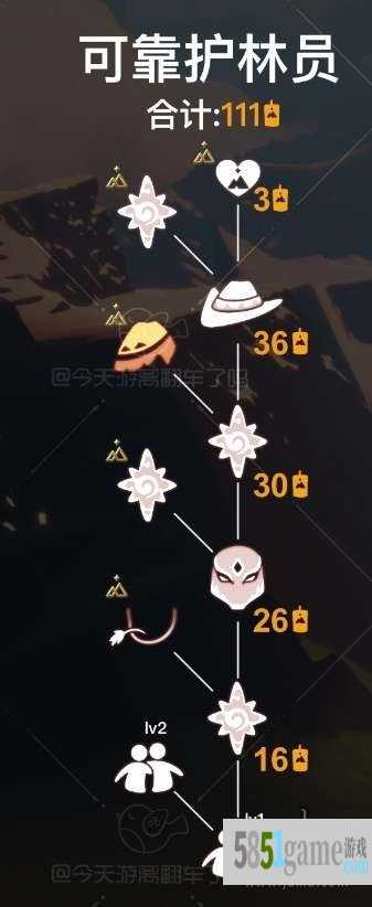 1、可靠护林员先祖兑换图如下图所示,兑换所有的物品需要111季节蜡烛。可兑换的物品有1~4级的勾肩搭背动作、一款面具、一款斗篷、一个帽子;