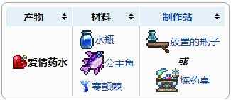 合成获得:在炼药桌或者放置的空瓶子处,使用1个水瓶+1个公主鱼+1个寒颤棘,可以合成获得1个爱情药水;
