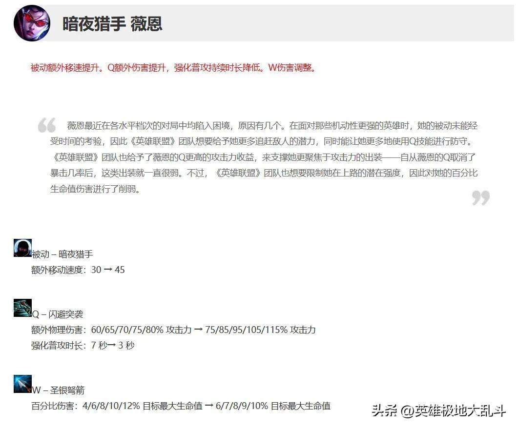 13.6版本加强了VN被动和Q技能,W技能加强前三级,削弱后两级伤害。