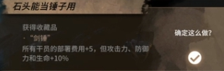 获得收藏品剑锤,所有干员部署费用+5,但攻击力、防御力和生命+10%,这种情况,非常不建议,所以不选择。