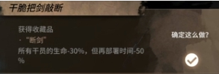 获得收藏品断剑,所有干员生命-30%,但再部署时间-50%,但非常考验我们阵容配合,先锋本子可以减50%部署,直接无限剑制,生命值没有那么重要,断剑操作还是非常强的。