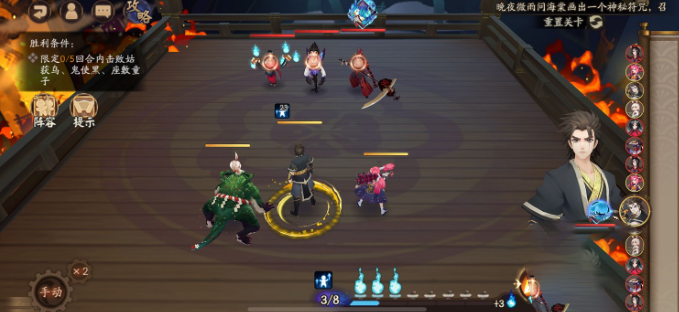 胜利条件限定0/5回合内击败姑获鸟、鬼使黑、座敷童子