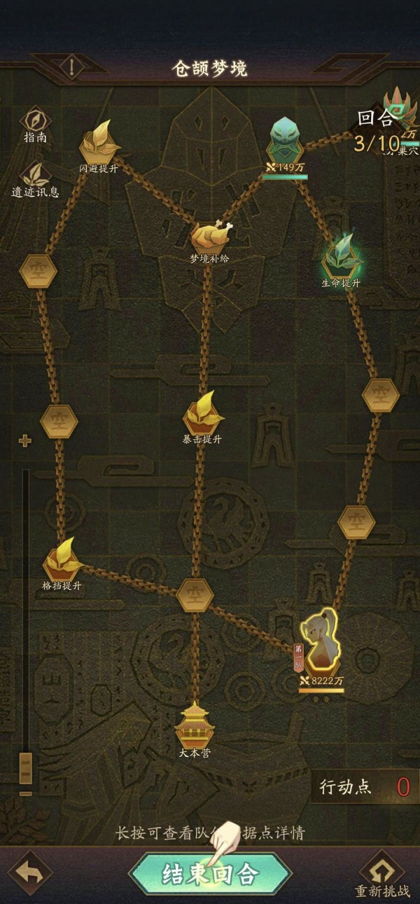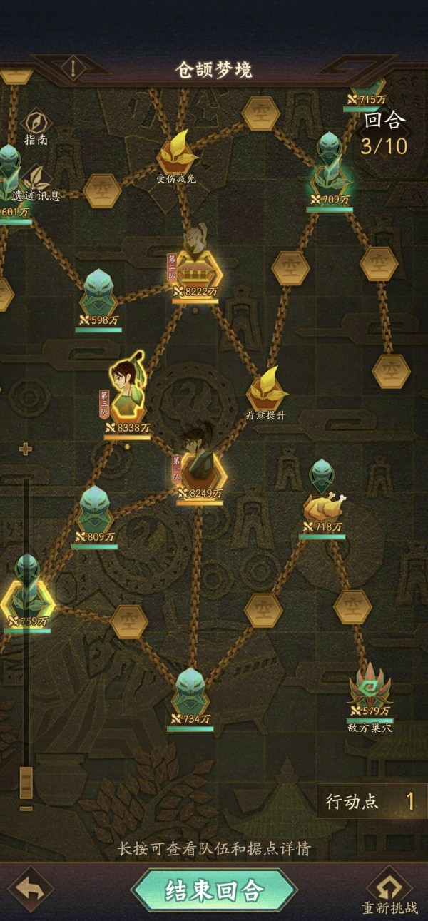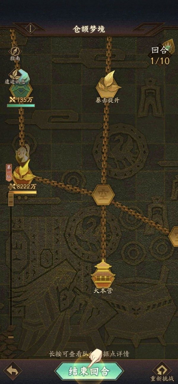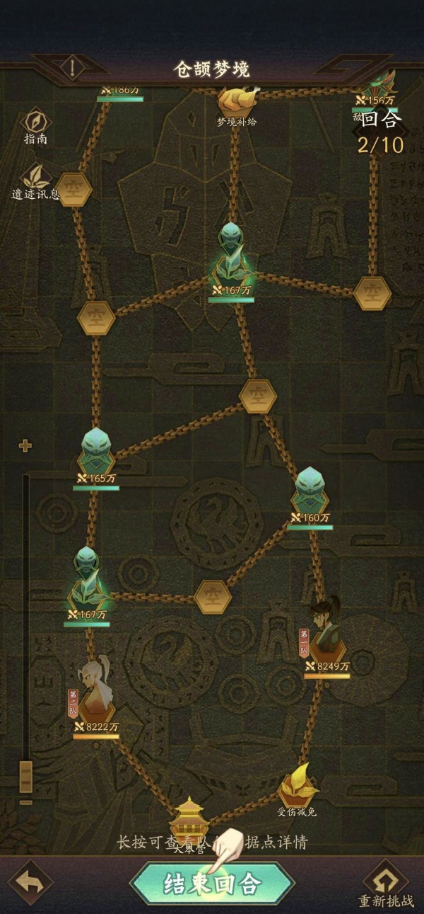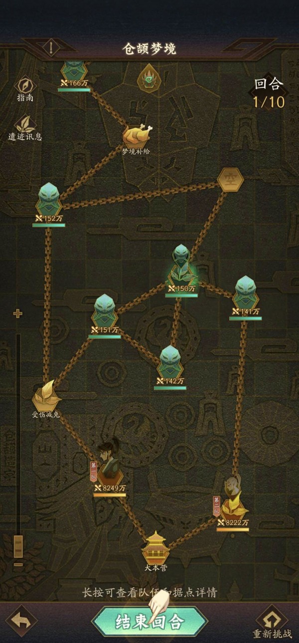 第二回合后:主队从右侧一路高歌猛进,副队在左侧不动如山,占领暴击提升梦境遗迹后继续镇守大本营。若主队状态保持在高位,可不领取梦境补给直捣巢穴,避免一场战斗。