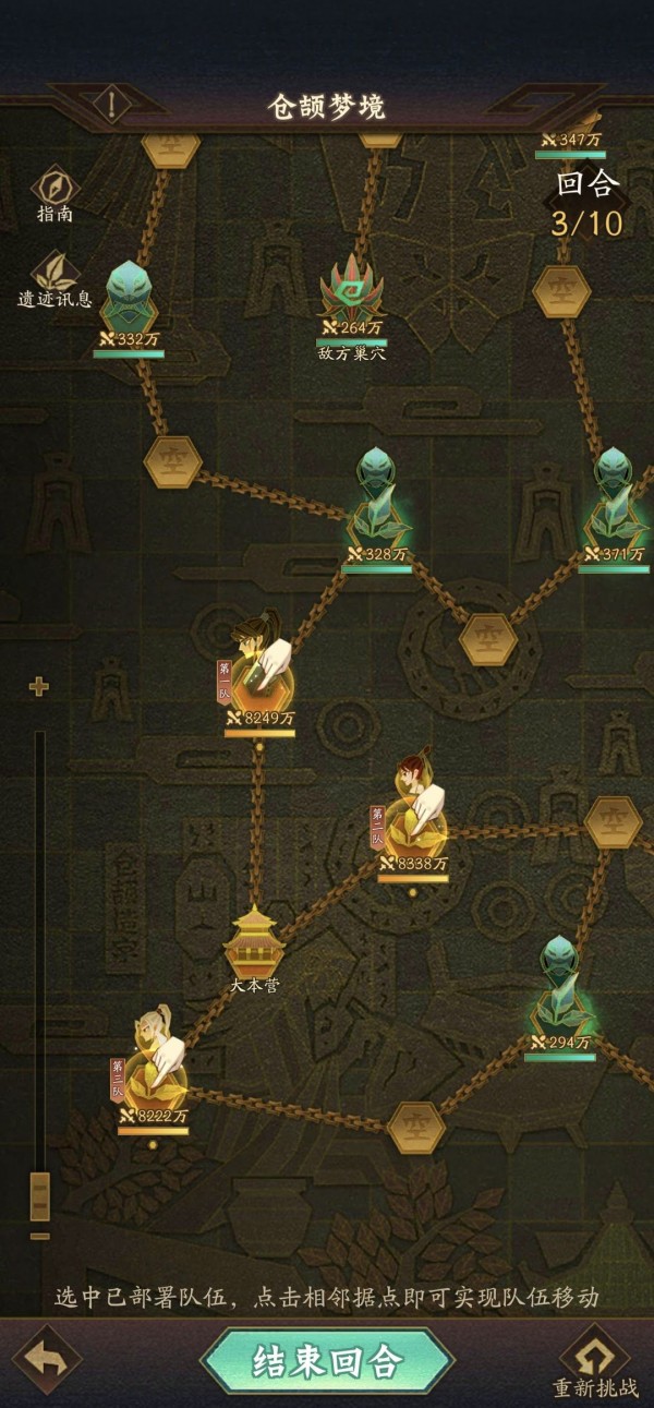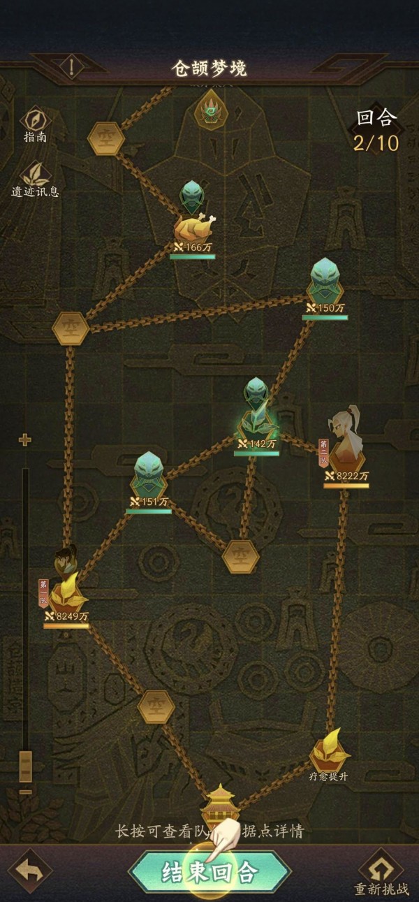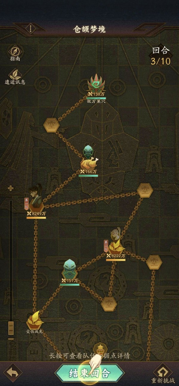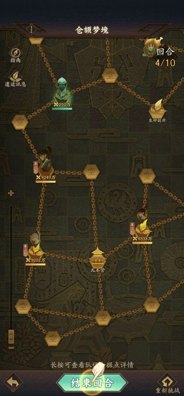 第四回合以后:副队若有余力可主动向左上或右上进军占领生命防御提升的遗迹节点,留1队据守大本营即可,主队继续前进捣毁敌方巢穴。