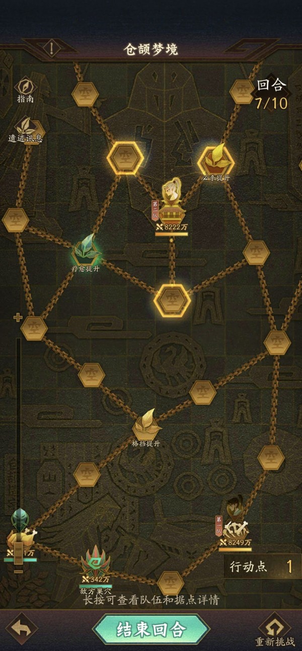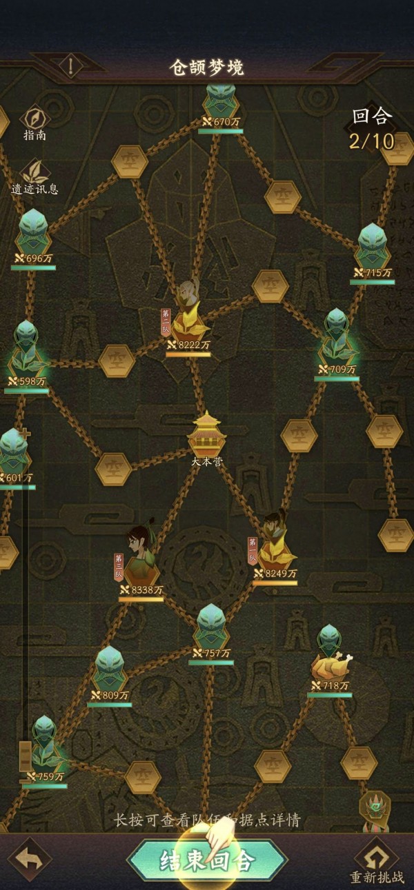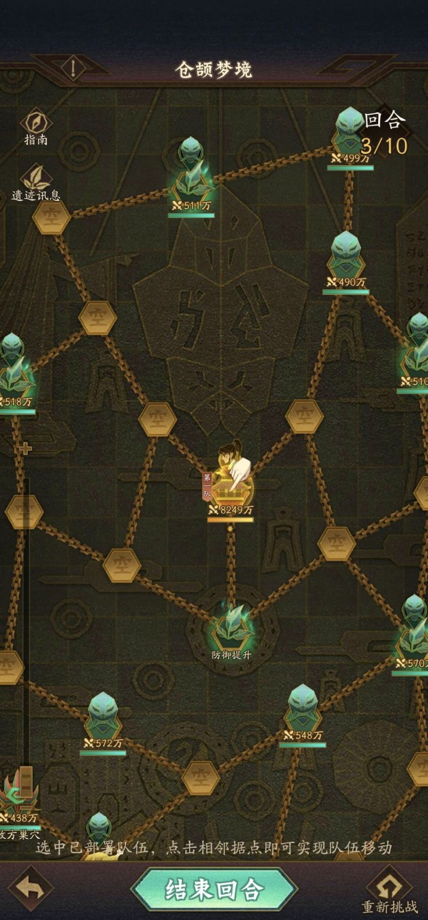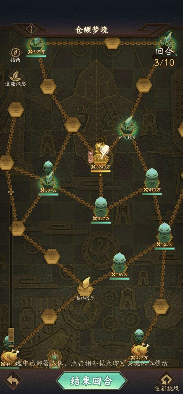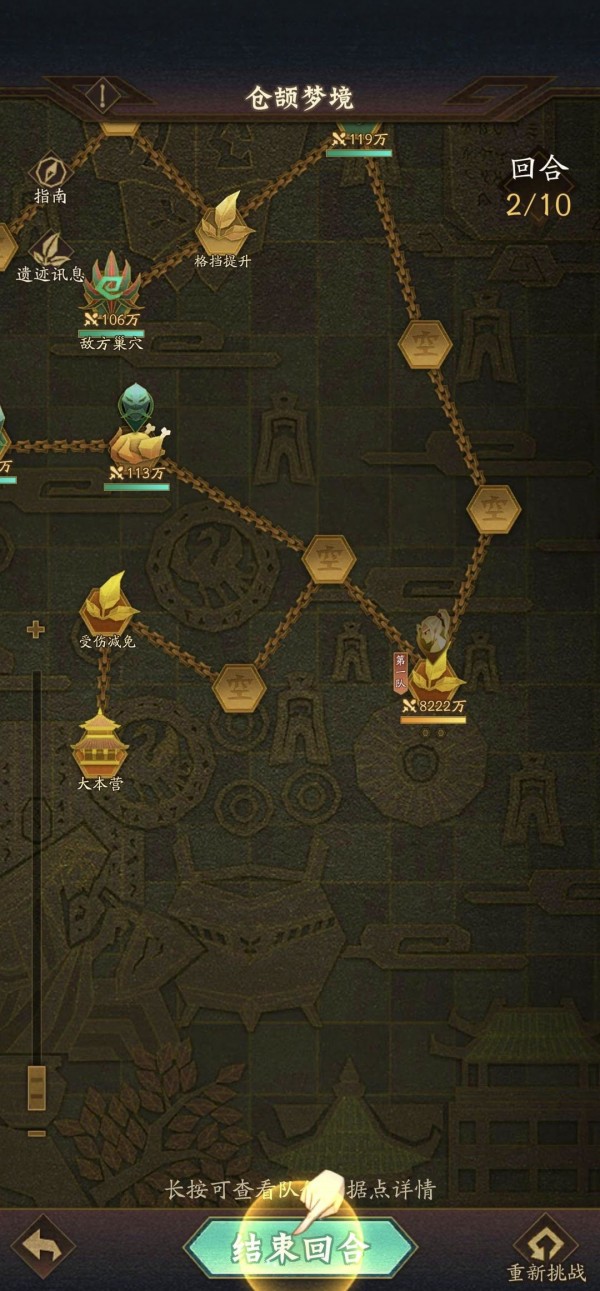 第四回合以后:副队若有余力可主动向左上或右上进军占领生命防御提升的遗迹节点,留1队据守大本营即可,主队继续前进捣毁敌方巢穴。