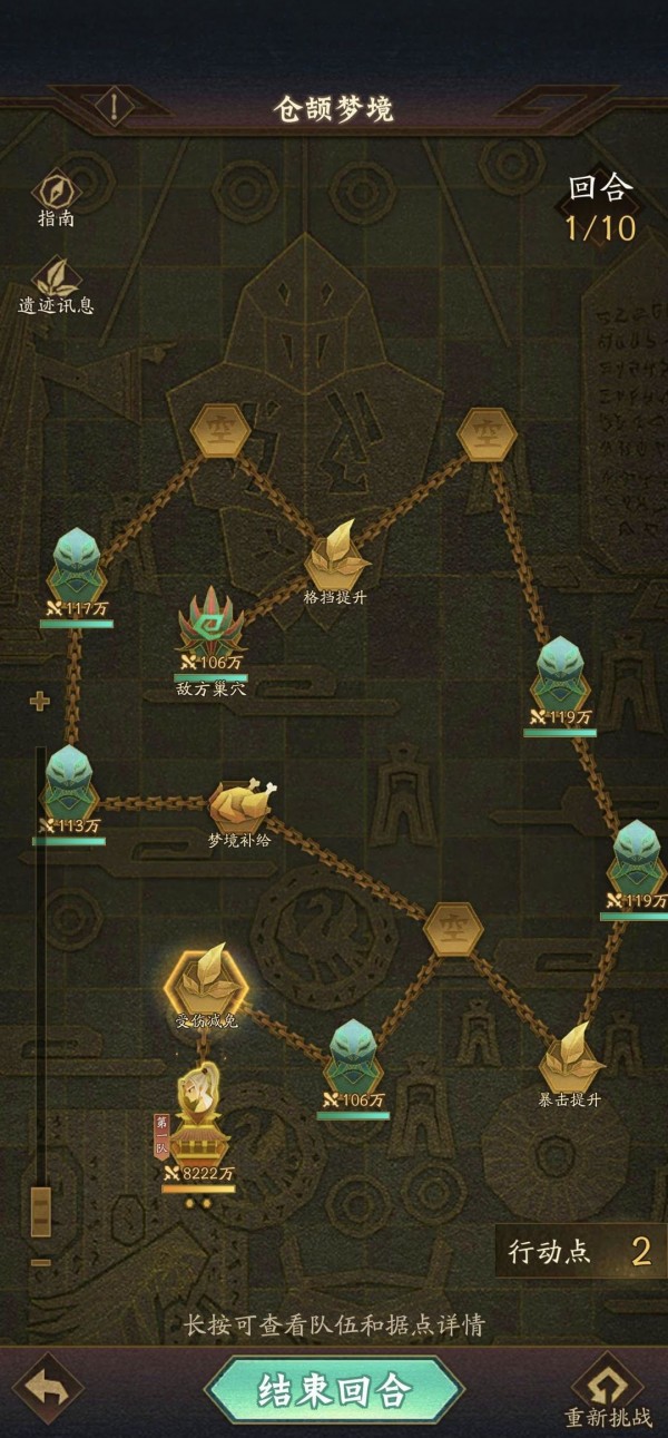 第一回合:主队向右进发解决大部分战斗,还能在梦境补给获得回复,副队驻守大本营左侧抵御来犯之敌即可。