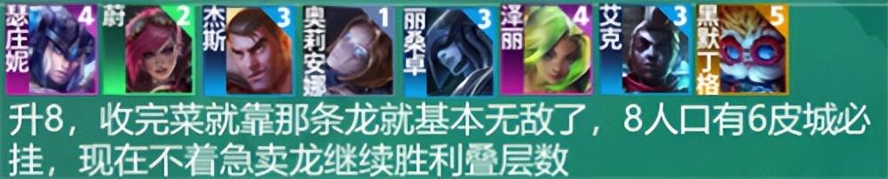 一旦有全责哥,这条龙变形那就无敌了,20层的龙一口是1000多伤害,30层2000多,40层3000多给圣杯直接4000多,一口后排就消失,蓝条还只有80,不到50层以上不要卖,卖不出什么好东西,连败的皮城才有比较强的龙,连胜的主要是为了20层的1000多AOE伤害加上3000多血量的坦克。5阶段找2星泽丽配个龙那就无敌,然后靠连胜一层层的叠龙的层数。50层以上就可以卖掉爽吃,如果是70层以上就是全体五费三星了,除非开局胡6皮城非常难达成,而且设计师说可能国测就取消了。