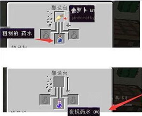 以上就是这次为大家带来隐身药水的具体制作方法了,在制作还是要提前收集到萝卜和金矿,后再去使用金矿合成金粒,接着去制作一个粗制的药水,之后和成夜视药水后加入发酵蛛眼就可以合成隐身药水了。