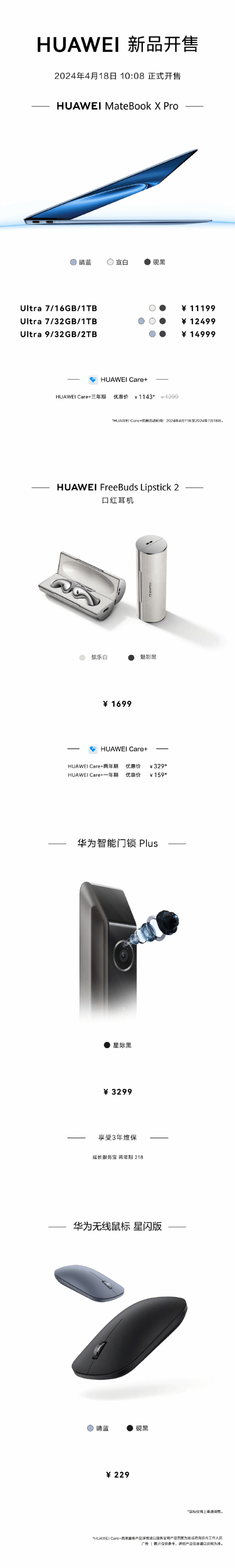 华为终端宣布,全新华为MateBook X Pro、华为FreeBuds Lipstick 2 口红耳机、华为智能门锁Plus、华为无线鼠标星闪版,将于4月18日10:08正式开售。在官宣中,华为并未提到Pura 70或其他任何手机系列。