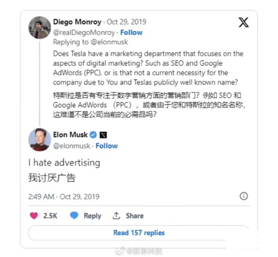 众所周知,马斯克一直对广告持抵制态度。特斯拉此前既不支付费用请名人代言,也不投放广告(尽管过去曾有过极少的特例)。特斯拉粉丝和投资者们经常建议特斯拉至少尝试一下广告营销,但马斯克一直对此持反对态度,甚至直言“讨厌”广告。