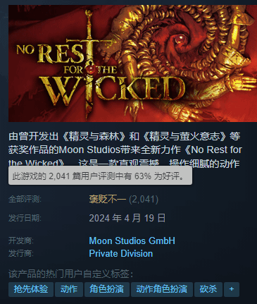 Moon Studios动作角色扮演新作《恶意不息》目前以抢先体验形式登陆了Steam平台,国区当前可享-10%优惠,售价125.1元。