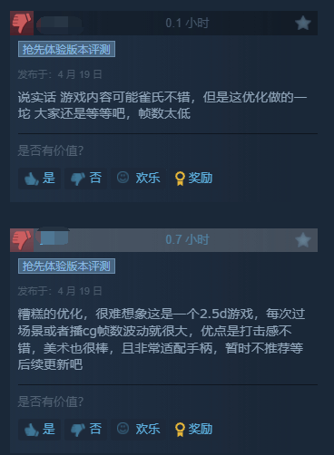 给出积极评价的玩家则称赞游戏战斗打击感十足,美术风格出色,期待后续更新。