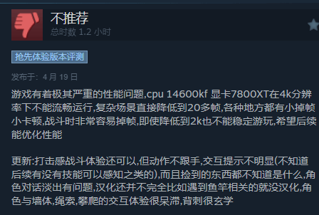 给出差评的玩家普遍指出游戏存在优化问题,在过场动画期间经常会出现帧数波动,有玩家称在其14600KF和7800XT的配置下,游戏不能以4K分辨率流畅运行,复杂场景直接降低到20多帧。另一个主要问题是游戏目前不支持改键,格挡初始键位是鼠标中键太折磨。