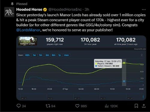 《庄园领主》打破了Steam平台上城市建设游戏类型的纪录。游戏官方今日发文宣布,《庄园领主》仅仅发布一天,销量便以突破了一百万份。Steam峰值在线玩家数量更为达到了17万,创下了城市建设/经营模拟类游戏有史以来最高的人数纪录。