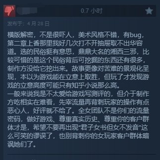 曾在宣传中标榜全程由4位女性应届生开发的中式恐怖解谜游戏《落花洞女》已于4月26日在Steam上线,售价18元,首发折扣20%。目前共143条评价,为“多半差评”。