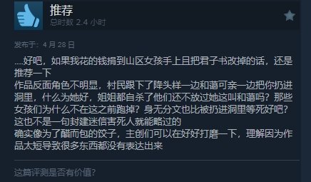 玩家在评价中称赞了本作题材具有新意,呈现出的民俗也令人眼前一亮;但由于本作制作组曾以全女班底为噱头,大量女性玩家围绕宣传与游戏内容不符这点进行了批评。