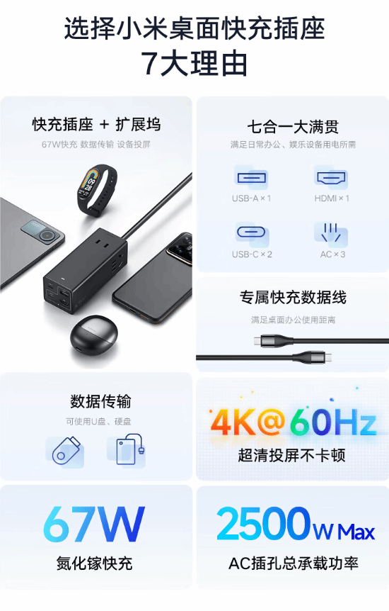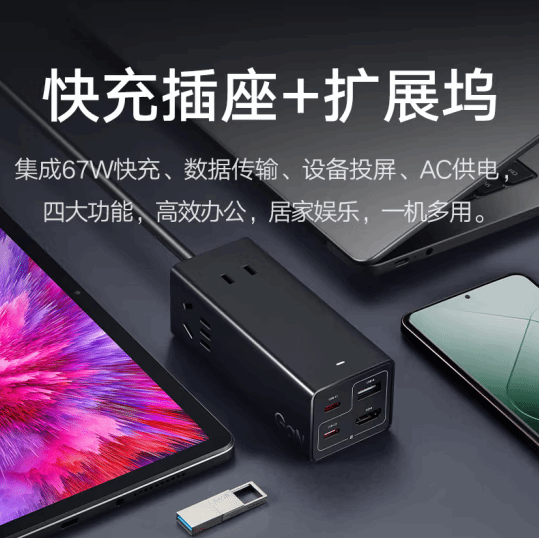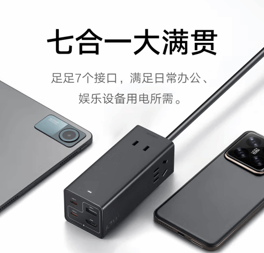 小米氮化镓67W快充插座Pro上架:七合一接口 199元