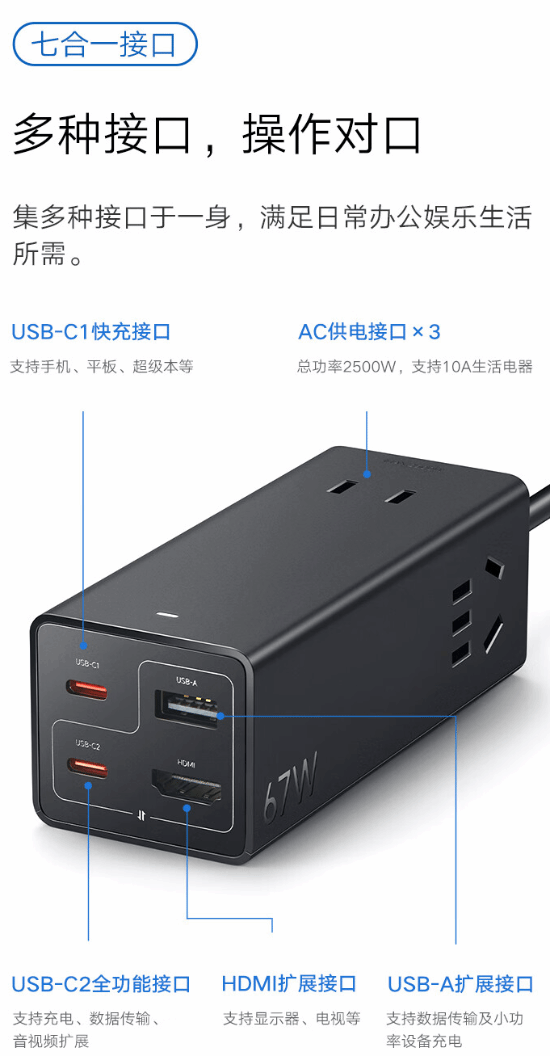 小米氮化镓67W桌面快充插座Pro正式上架,售价199元,开始预约抢购,该插座共配有7个接口,分别为:USB-A、HDMI各一个,两个USB-C以及三个AC插座。