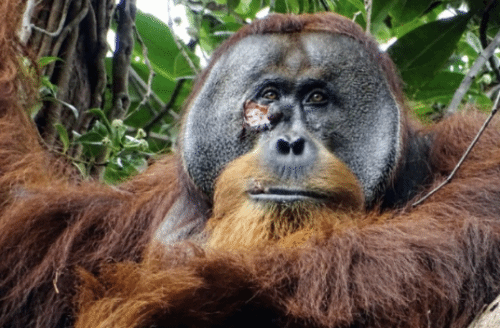 这只猩猩被发现使用了一种已知具有消炎止痛作用的植物治疗面部的开放性伤口。这是野生动物首次被观察到用已知具有药用价值的物质处理开放性伤口。
