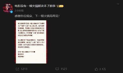 官方在公告中写道:“自上映以来,因为各种环境因素,导致影片没有与更多的观众见面。” “在认真研判目前的情形后,为满足更多观众的需求,我们的‘火锅’将于5月6日撤档。”