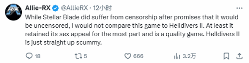 而也有玩家并不这么认为:“虽然《星刃》在承诺不会遭遇审查之后确实遭到了和谐,但我不会将这款游戏和《地狱潜者2》相提并论,至少它很大程度上保留了它的性感内容并且它是一款高质量的游戏。《地狱潜者2》简直是垃圾。”