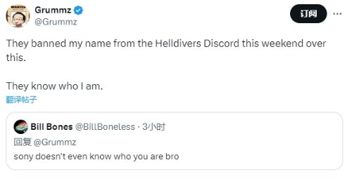 一位网友嘲讽道:索尼甚至不知道你是谁,Grummz表示他们知道我是谁,“他们在本周末禁止我的名字出现在《地狱潜者2》的Discord中。”
