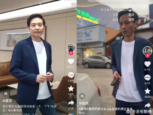 经过查询,“雷民”自5月2日发布的视频开始模仿雷军,身着雷军此前穿的蓝色西服、T恤、牛仔裤、白色板鞋,发型基本相同。
