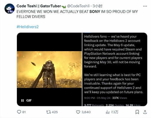 玩家们纷纷发文庆祝,称在这场玩家和索尼的战争中获得了胜利。