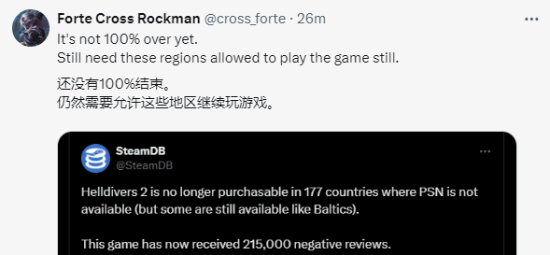 今日,索尼终于对《地狱潜者2》强制绑定PSN作出回应,表示不会推出该更新。在这之后,网友们纷纷发文庆祝此次胜利,感谢玩家们的共同努力。