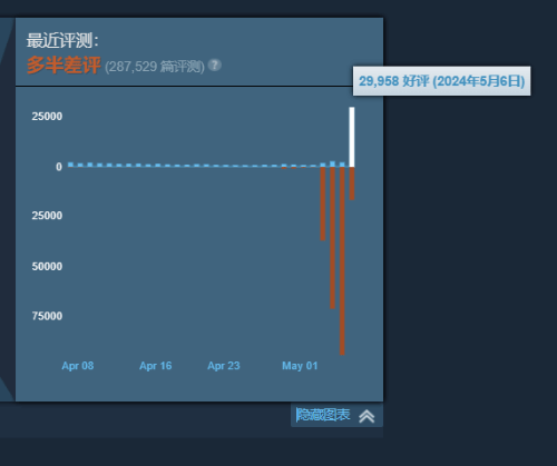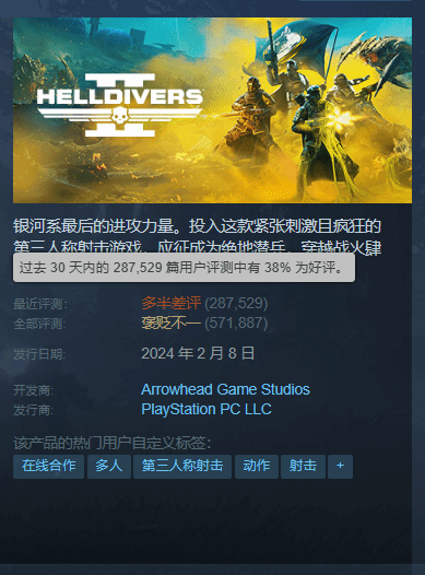 在Steam上可以看到,截止撰文,《地狱潜者2》5月6日收获了近3万条好评,1.6万差评。而本作的Steam近期评价也已经回升至“多半差评”(好评率38%),全部评测好评率回升至“58%”。