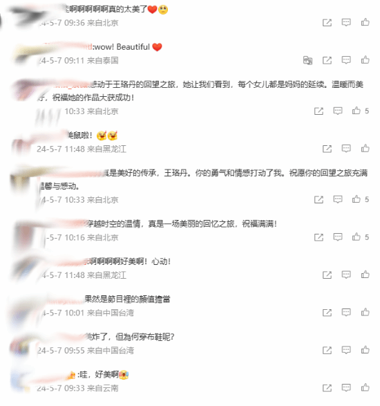 王珞丹本人表示,此举是为了回应母女情感真人秀《是女儿是妈妈》节目组的命题——复刻妈妈的少女时代,在评论区中,网友们纷纷称赞王珞丹的颜值担当。