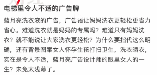 近日,多名网友吐槽,蓝月亮母亲节文案令人不适。文案称,“了不起的未来洗衣科技,让妈妈洗衣更轻松、更省力、更省心。”产品外包装上印有“妈妈您先用”字样,广告牌上全是女性做家务的剪影。