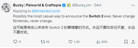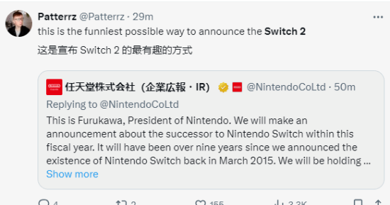 由于现在美国时间还是凌晨,还有玩家调侃任天堂在凌晨3点官宣了Switch 2。“这可能是有史以来最随意的公布方式。”