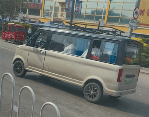 网友街头偶遇“商务老头乐”:满载7人还配有窗帘
