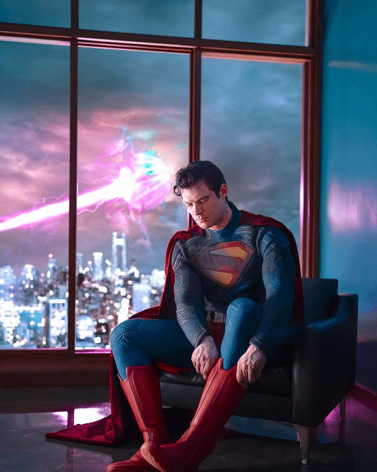 这张照片中的姿势似乎也是有意为之,克拉克有条不紊地穿上靴子,准备再次进入战场。这是我们从未见过的超人谦逊的一面。在过去的超人电影中,超人总是穿着全套战服出现在战斗中。这张照片传达的信息很明确,超人也是和普通人一样穿衣。此外,这件战服似乎设计得不像过去的那么合身。