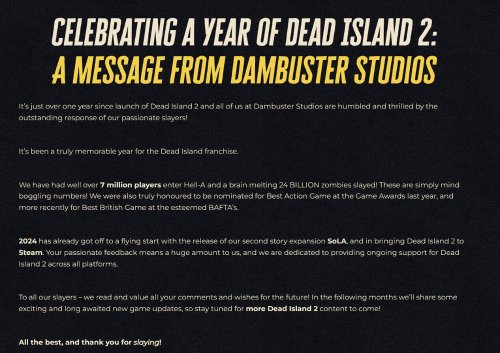 Dambuster还透露,他们将致力于在所有平台上“持续支持”这款游戏:“在接下来的几个月里,我们将分享一些令人兴奋和期待已久的新游戏更新,所以敬请期待《死亡岛2》更多的内容!”