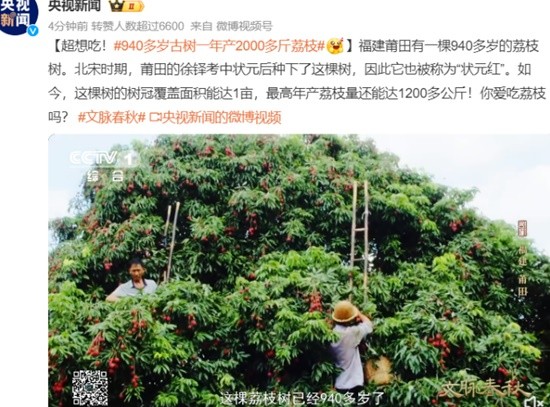 据央视新闻报道,福建莆田有一棵940多岁的荔枝树。