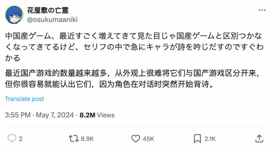 近日,一条日本网友谈论中国游戏的推文引发大量网友转发讨论,近9千转发,4.5万赞。这位网友表示,最近中国游戏数量越来越多,从表面来看很难将其和日本游戏区分开。但很容易就能认出是中国游戏,因为角色会在对话时突然开始吟诗。