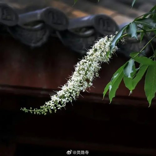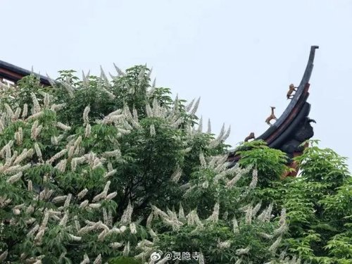 近日,杭州灵隐寺内的七叶树开花了。七叶树被称为佛门圣树之一,花簇远看就像一座座白色的小宝塔。七叶古树植何年,叶叶枝枝翠色鲜。只为昔时受记莂,今来此地荫人天。