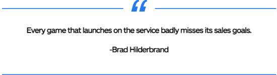 Brad Hilderbrand表示由于Xbox粉丝现在已经习惯于通过该服务来玩大型游戏,因此微软无法再向其核心受众销售游戏。他表示,随着时间的推移,即使是该服务中最热门的游戏也会失去人气。他还引用了分析师Matt Piscatella最近提供的数据,称“在XGP上推出的每一款游戏都严重达不到销售目标。”