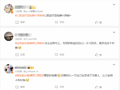 5月10日,#百度副总裁璩静已离职#登上微博热搜。