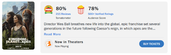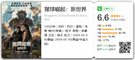 截至发稿前,《猩球崛起:新世界》在豆瓣中的评分为6.6分,共有17207人参与评价。其中给予4星与3星的影迷居多,分别占比31.9%以及42.3%,烂番茄新鲜度为80%。