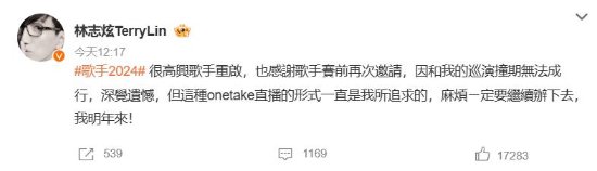 文中称:很高兴歌手重启,也感谢歌手赛前再次邀请,因和我的巡演撞期无法成行,深觉遗憾,但这种onetake直播的形式一直是我所追求的,麻烦ㄧ定要继续办下去,我明年来!