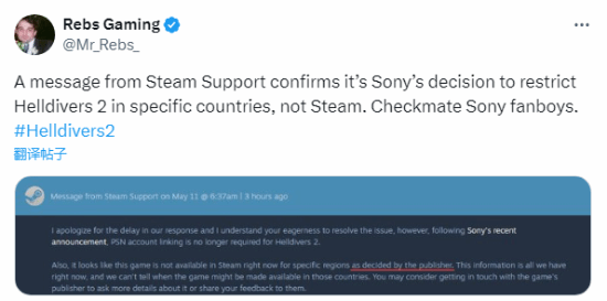 Steam官方确认:限制《地狱潜者2》上架国家是索尼决定