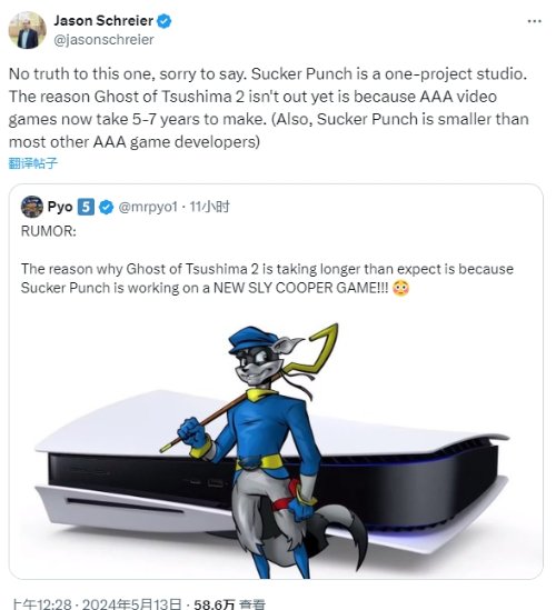 随着这一说法的传播,彭博社的Jason Schreier对其进行了反驳。“很抱歉,这不是真的。Sucker Punch是一家只有一个项目的工作室,《对马岛之魂2》之所以还没有推出,是因为现在的3A级游戏需要5-7年才能制作完成。(另外,Sucker Punch 比其他大多数3A级游戏开发商都要小)”,他说。