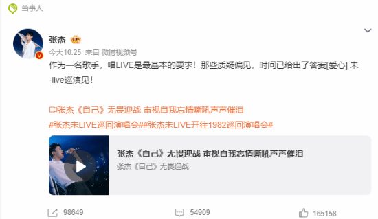 5月13日,歌手张杰发布自己2017年在《歌手》的演出现场,并配文:“作为一名歌手,唱LIVE是最基本的要求!那些质疑偏见,时间已给出了答案。”
