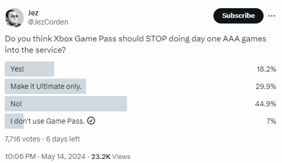 Jez表示,他发起这项调查的原因是很多人声称首发XGP会伤害开发者,所以他想听听大家的想法。有人认为,首发XGP对游戏销量有负面影响,长久下去对工作室不利。也有人认为XGP是Xbox硕果仅存的阵地,微软需要发挥它的价值,不能轻易放弃。