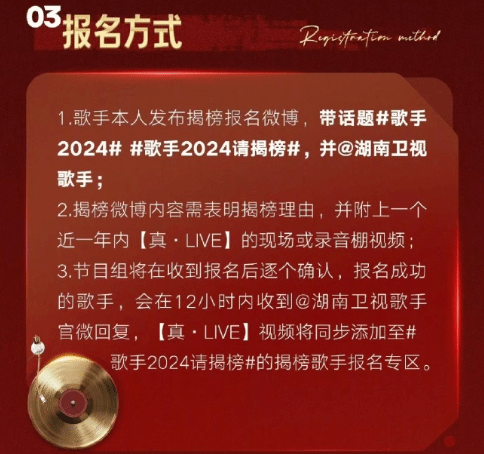 之后,竟然有网友翻出了《歌手》官方的报名细则,表示韩红的报名方式错了,正确的报名方式是带上相关话题Tag,然后再艾特官方。微博内容还需写明揭榜理由,配上现场或录音棚视频等。相关话题也登顶微博热搜。
